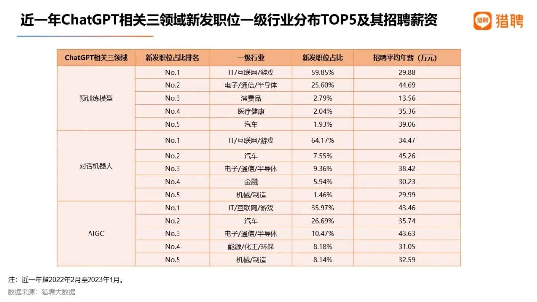 根据猎聘大数据研究院针对上述三个方向新发职位所在行业的统计,三个职位数量最高的雇主均为IT/互联网/游戏行业,预训练模型、对话机器人、AIGC职位占比分别为59.85%、64.17%、35.97%,也即这三类职位一半都是互联网行业发布的。