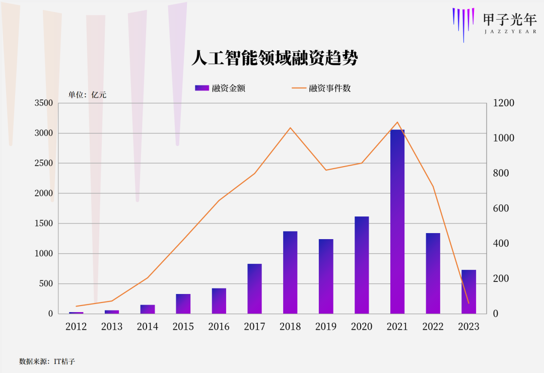 人才与资本相伴相生。就在AI人才备受关注的同时,敏锐的VC也在快速涌入。IT桔子的统计数据显示,2023年开年至今一个半月的时间,AI领域融资额已达到729亿元,这一数量超过去年全年1340亿元的一半。