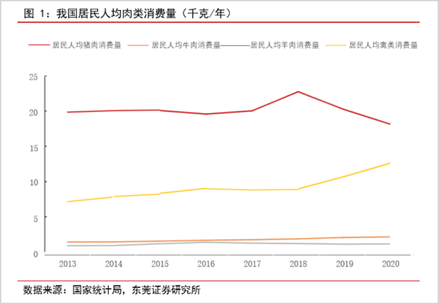 近年来,我国居民年人均猪肉消费量呈递减态势,而对禽肉的消费量却稳定上升。健康膳食的大趋势下,鸡肉低脂高蛋白的特性,使其在年轻群体中广受欢迎,也为未来行业的长期上升奠定了基础。