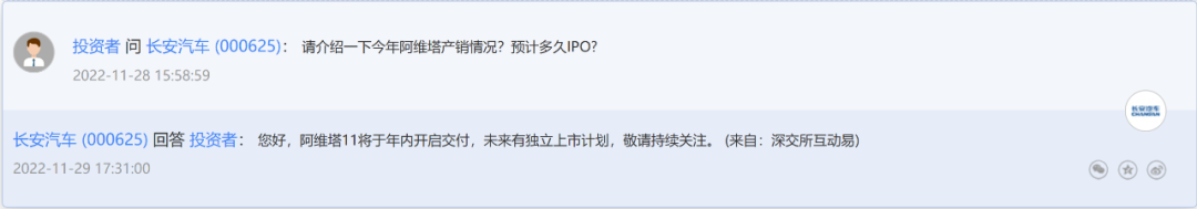 也正因如此,同在去年8月,在首款SUV阿维塔11上市前,阿维塔就融到了25.47亿元。与此同时,该品牌于同月在投资者互动平台又被投资者追问有无独立上市计划,长安汽车相关人员表示肯定。