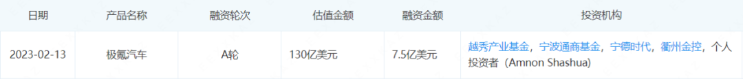 近期,极氪宣布完成了一笔价值7.5亿美元的A轮融资,投资方群星璀璨,由知名自动驾驶科技公司Mobileye创始人兼CEO Amnon Shashua教授、宁德时代、越秀产业基金、通商基金以及衢州信安智造基金等五家生态伙伴参投,这也成为了2023年新能源赛道第一笔大额融资。