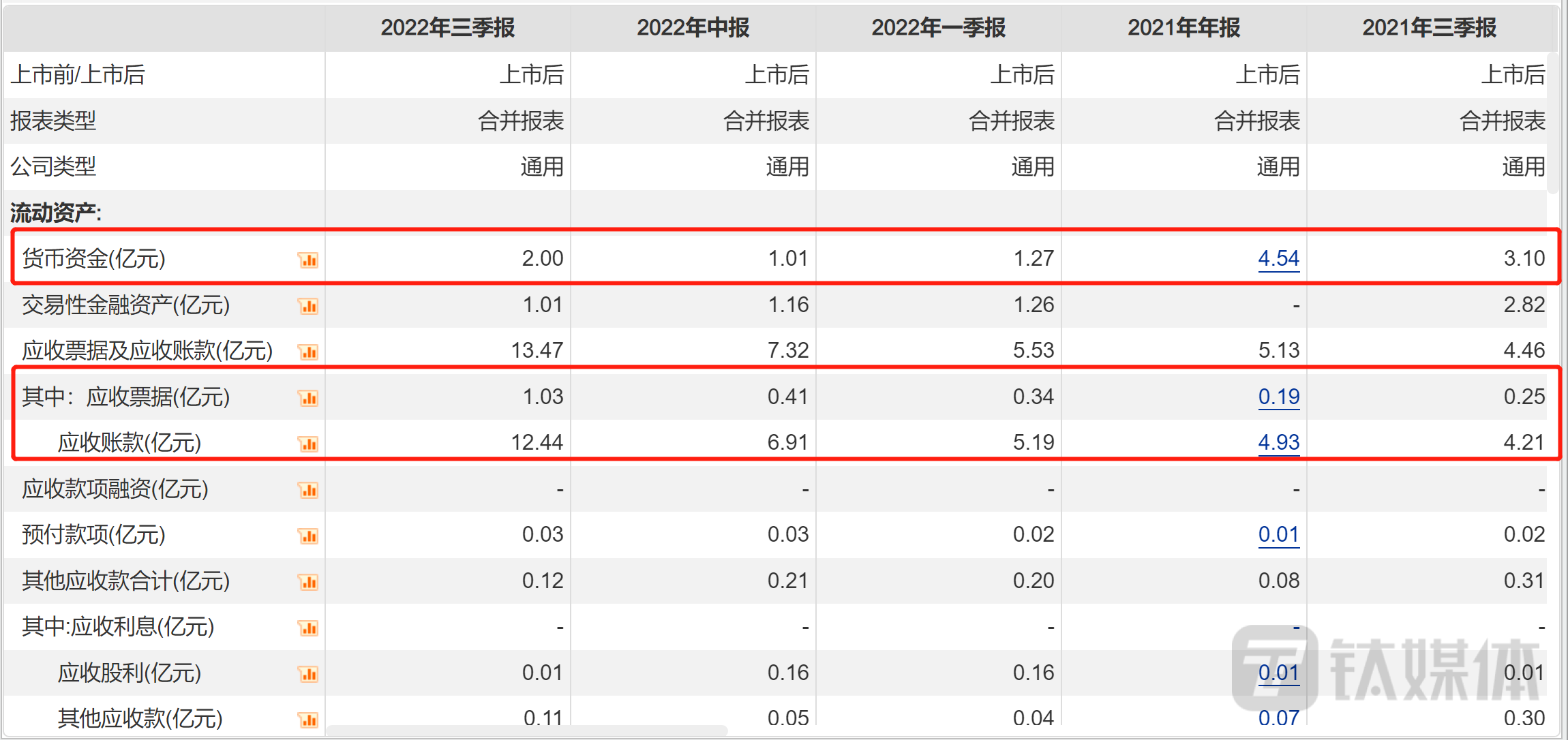 对于可立克,其目前的账面资金压力也是每况愈下。截至去年9月30日,可立克的账面资金仅为2亿元,较2021年底的4.54亿元大幅下降超50%。而应收票据及应收账款近年来却大幅攀升,从2020年的3.31亿元增资至2022年上半年的7.32亿元。