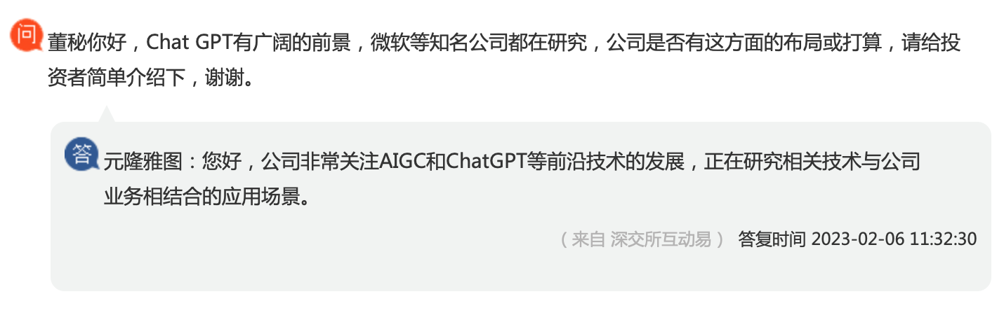 2月20日,公司在投资者互动平台提示称,“目前公司不涉及人工智能底层核心技术的开发,但正在积极研究开发相关技术与公司业务相结合的应用场景。作为一项新的技术,ChatGPT的应用还有很多不确定性,请广大投资者注意投资风险。”今日元隆雅图开盘一度升至23.57元/股,午后开始转跌,截至收盘报21.13元/股。
