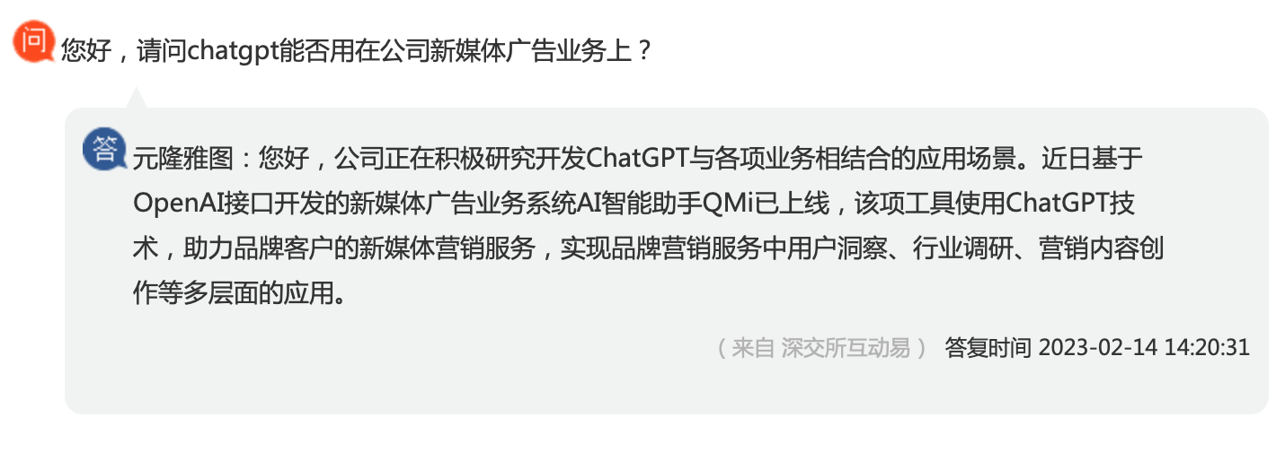 对于近期元隆雅图股价被炒高的原因,或与最近大热的“ChatGPT”概念有关。此前在2月14日,公司在投资者互动平台透露,其基于OpenAI接口开发的新媒体广告业务系统AI智能助手QMi已上线,该项工具使用ChatGPT技术,助力品牌客户的新媒体营销服务,实现品牌营销服务中用户洞察、行业调研、营销内容创作等多层面的应用。