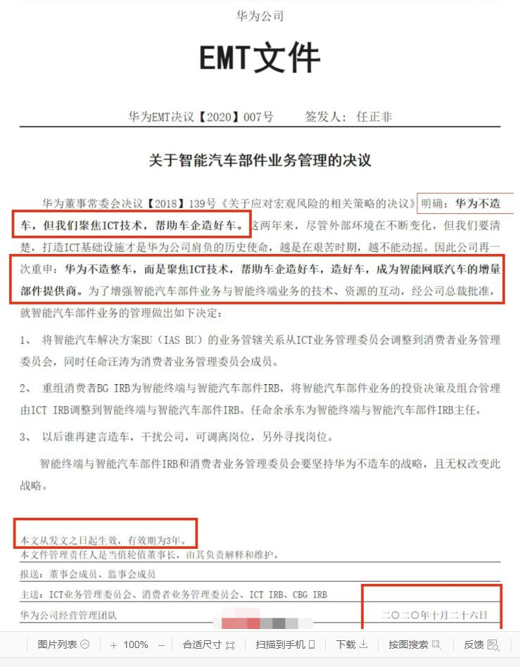 何为三年禁令呢?为了打消市场顾虑,华为董事会在2020年10月发布了内部公告,称三年内,华为不造整车,而是聚焦ICT技术,帮助车企造好车。