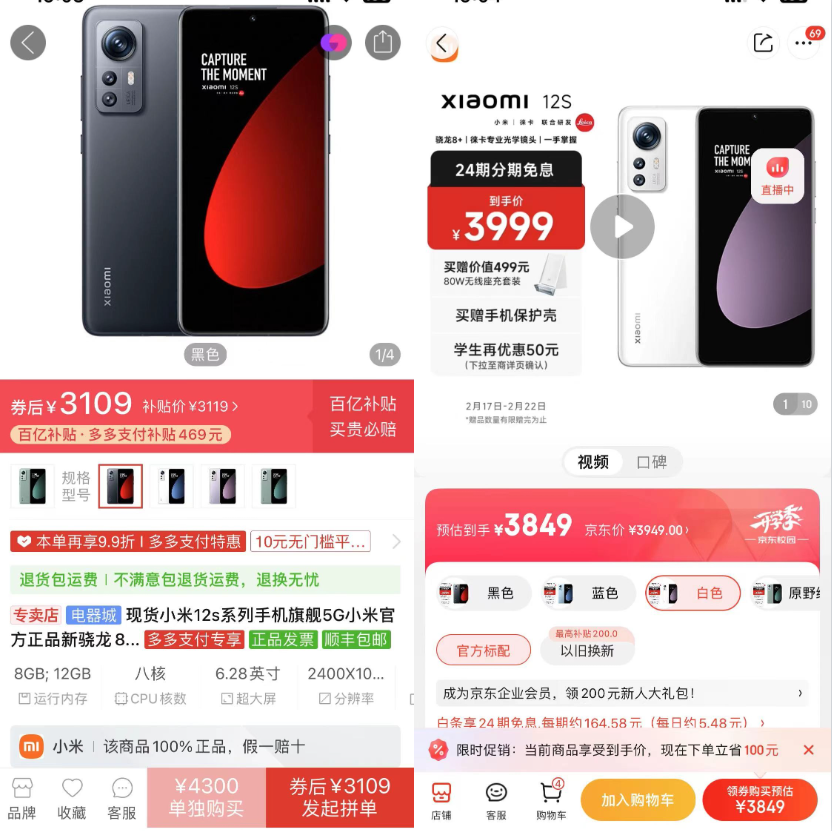 总体而言,在一些重点关注的产品上京东的优惠力度并不比拼多多低,但是在iPhone之外的品类,京东的3C数码优势正在快速下滑。比如去年热门的小米12s系列,京东自营的价格就十分稳定,除双十一和年货节外基本都维持在原价上,而在拼多多的百亿补贴里,小米12s系列起步价已经降到3000元以内。