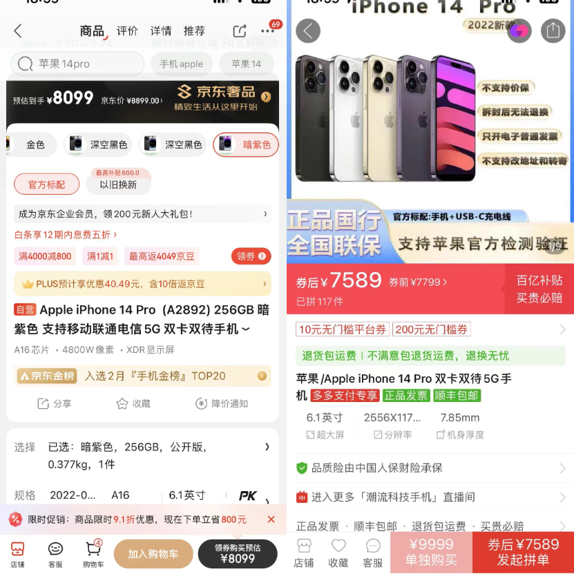 以iPhone手机为例,从2月份开始不少渠道都对iPhone 14 Pro进行了大幅度的降价促销,京东给出的优惠力度达800元,原价7999元只需7199元即可入手。但是拼多多则更狠,在其他平台的补贴价基础上又给出了500元的优惠补贴,把iPhone 14 Pro的价格降到了6699元左右。