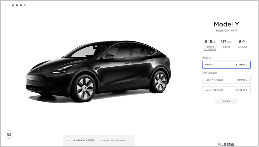 这是进入2023年后,特斯拉在中国市场上的第二次涨价。就在2月10日,特斯拉中国官网显示,Model Y后驱版涨价2000元至26.19万元。预计交付时间为2-5周。