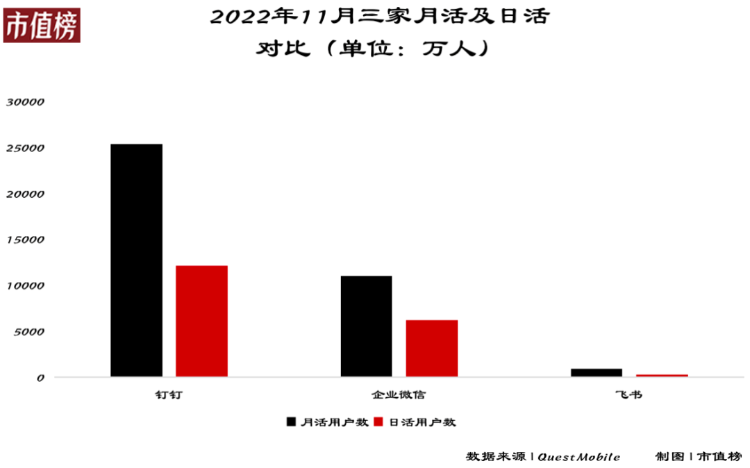 第一是如何持续提升MAU。QuestMobile数据显示,2022年钉钉的MAU突破了2亿,企业微信突破了1亿,但飞书依然停留在百万级别。