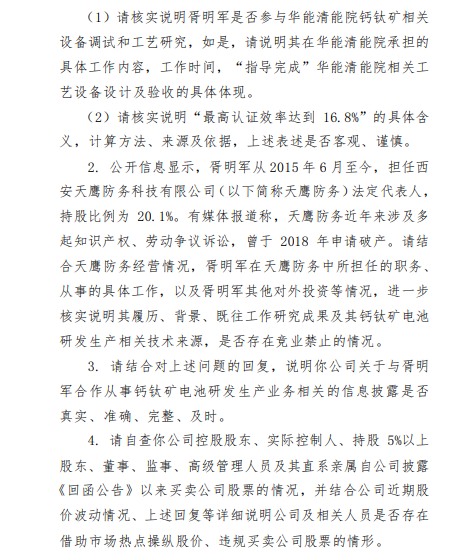 对此,深交所要求奥联电子核实说明胥明军是否参与华能清能院钙钛矿相关设备调试和工艺研究,如是,需说明其在华能清能院承担的具体工作内容,工作时间,“指导完成”华能清能院相关工艺设备设计及验收的具体体现,核实说明“最高认证效率达到 16.8%”的具体含义,计算方法、来源及依据,上述表述是否客观、谨慎。