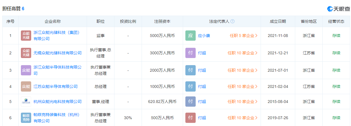 钛媒体APP注意到,胥明军此前的工作经历几乎都集中在上述三家公司,而这三家公司之间也有着千丝万缕的关系。天眼查显示,众能光电的法定代表人为付超,这家公司是一家新四板公司,成立于2015年。不仅如此,付超还是无锡众能光储科技有限公司的总经理与执行董事,这家公司的注册资本达3000万元。同时,付超还是浙江众能光储科技(集团)有限公司的监事,这家公司的注册资本达到5000万元。