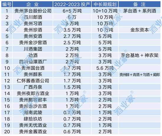面对上述趋势,酱香酒企纷纷进行扩产,以图第一时间抢占市场红利。酒业家统计的数据显示,目前有二十家酒企有扩产计划。比如,2022年末,茅台宣布针对“十四五”技改建设项目投资约155.16亿元,项目建成后,茅台酒将新增实际产能约1.98万吨/年,新增储酒能力约8.47万吨。