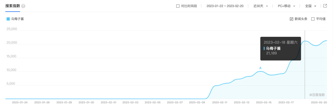 据百度指数显示,乌梅子酱的搜索指数在2月10日开始上升,2月14日情人节出现一个小高峰,之后在2月18日再一步攀升。抖音上用来制作翻唱视频的合拍伴奏内容,基本都在2月8、9日发布,给用户拍翻唱视频提供了便利,从而带来2月10日搜索指数上升的结果,这也进一步佐证了《乌梅子酱》的热度很可能来自于翻唱。