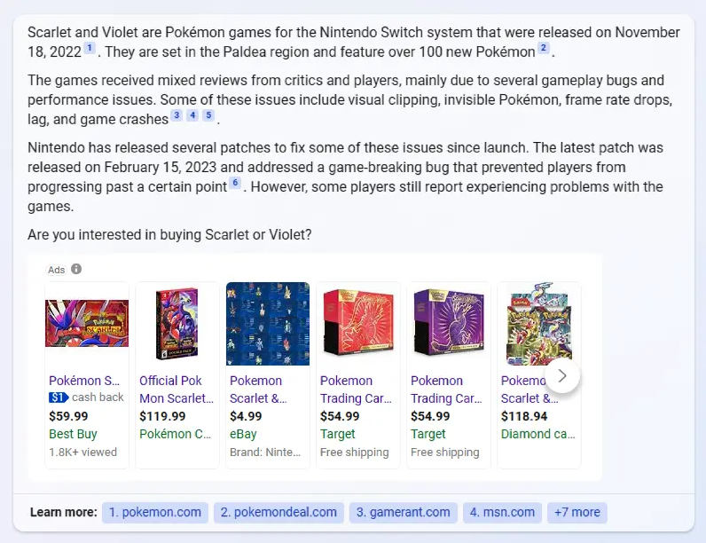 来自Reddit的一份帖子显示,新必应在回复结果呈现页面中会给出一些跟搜索内容相关的产品广告,如用户搜索《宝可梦》相关问题时,新必应会给出相关商品的广告链接。