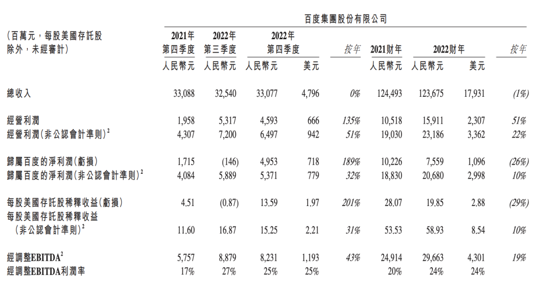 当天发布2022年第四季度财报之后,百度股价美股盘前一度大涨7.6%,开盘后却由涨转跌,最终当天收盘后百度股价下跌2.6%。