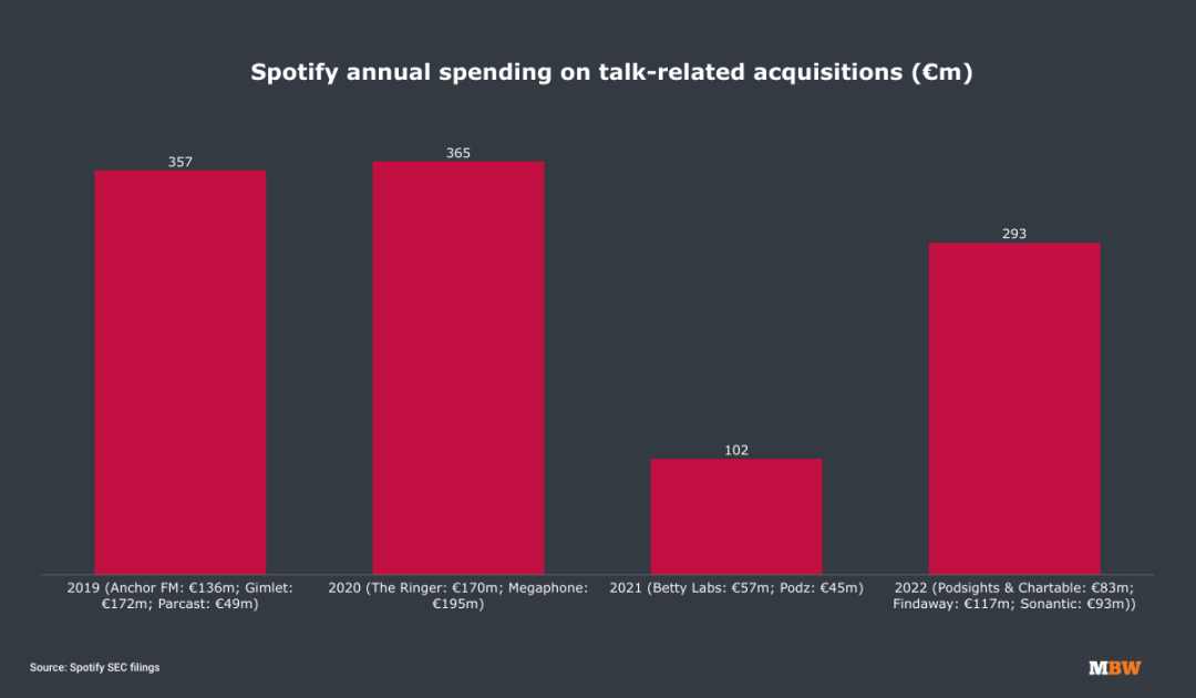 即便三大唱片可以从中分去约七成,剩下的4个多亿美元对于Spotify重要的播客投资布局也能起到重要作用。数据显示,在过去的四年中,Spotify在播客等非音乐业务上花费了约12亿美元。