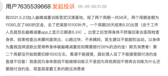 “投诉没用的,体重变化这事没法评断,教练会说运动是瘦了的,是我自己吃多了……总之没人管得了他们退不退钱。”