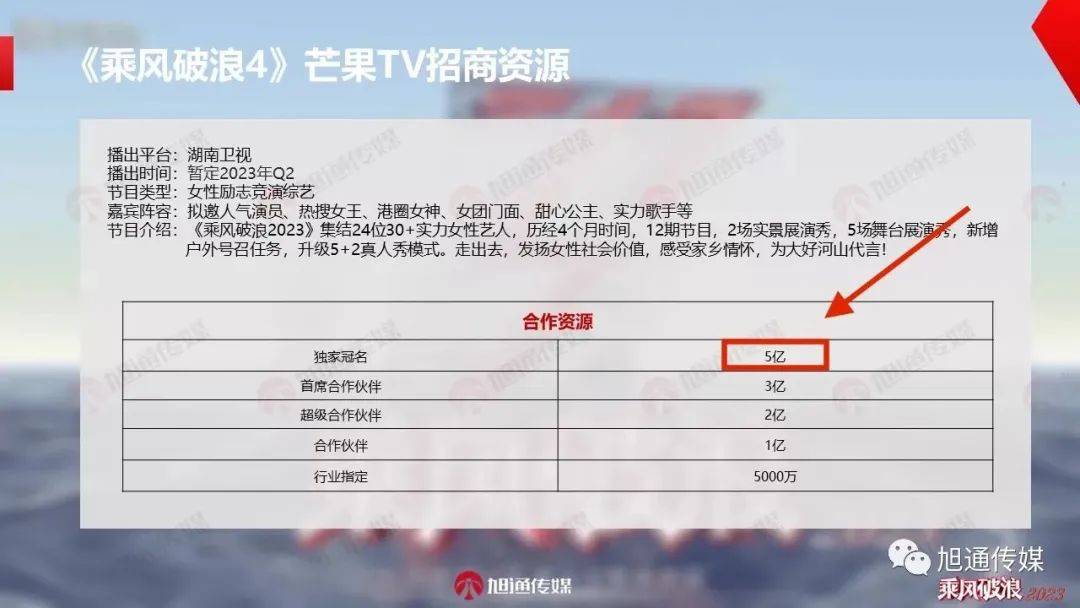 就在最近,知名品牌服务机构「旭通传媒」发布的“《乘风破浪4》招商案”引起了社交平台的热议,原因是该招商案清楚点明了本季《浪姐》的独家冠名费定价到了“5亿”。