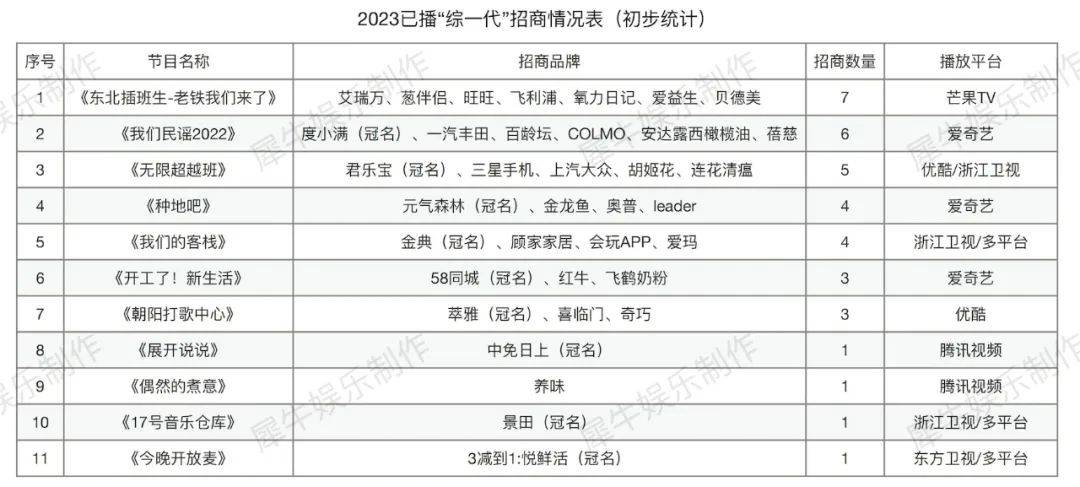 一面是新综项目向裸播说不。开年以来,Q1大部分“综一代”几乎都找到了冠名,且有不少新综取得了亮眼的招商成绩,《东北插班生-老铁我们来了》《我们民谣2022》《无限超越班》都招揽到了5家以上的赞助,《种地吧》《我们的客栈》则得到4家品牌垂青。
