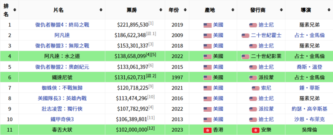 作为一个全球性的市场,港产片一直以来与外片公平开放地竞争,导致外片在近30年的市场中占绝对优势。翻看香港市场排名前十的影片,6部来自漫威、3部来自卡梅隆,还剩1部是去年席卷全球的《壮志凌云2:独行侠》。这样的影史纪录实际上和全球影史纪录十分相似,香港前十里有8部影片均排在全球影史票房的前十五以内。