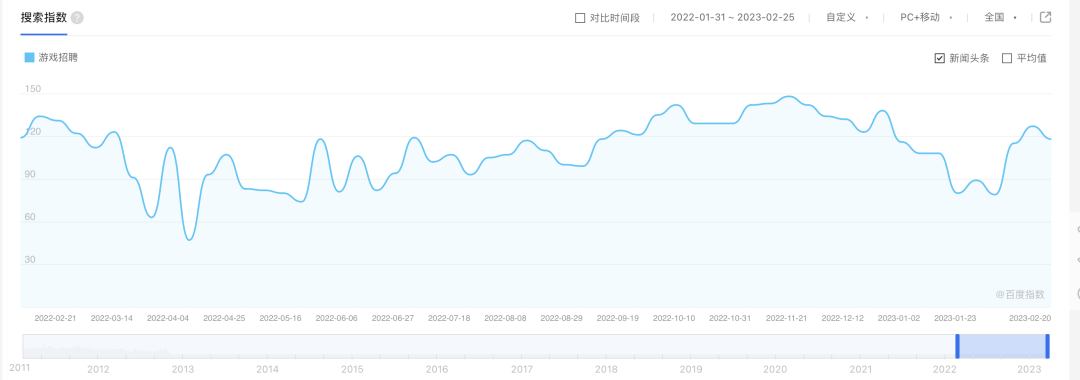 百度指数显示,今年1月下旬之后,关于【游戏招聘】的百度搜索指数有明显上升,这也从侧面印证了相关求职者的数量在激增。