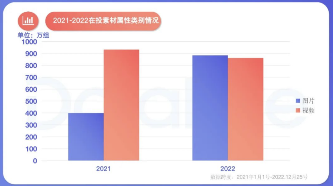 在这方面,DataEye研究院统计到,2022年在投素材中,图文素材投放约同比2021年增长约130%,视频素材投放量同比下滑9%。相较于视频素材,图片往往更容易制作,因此也不太需要人力成本(比如写脚本、剪辑),这或许也是导致营销人才岗位下降的原因之一。