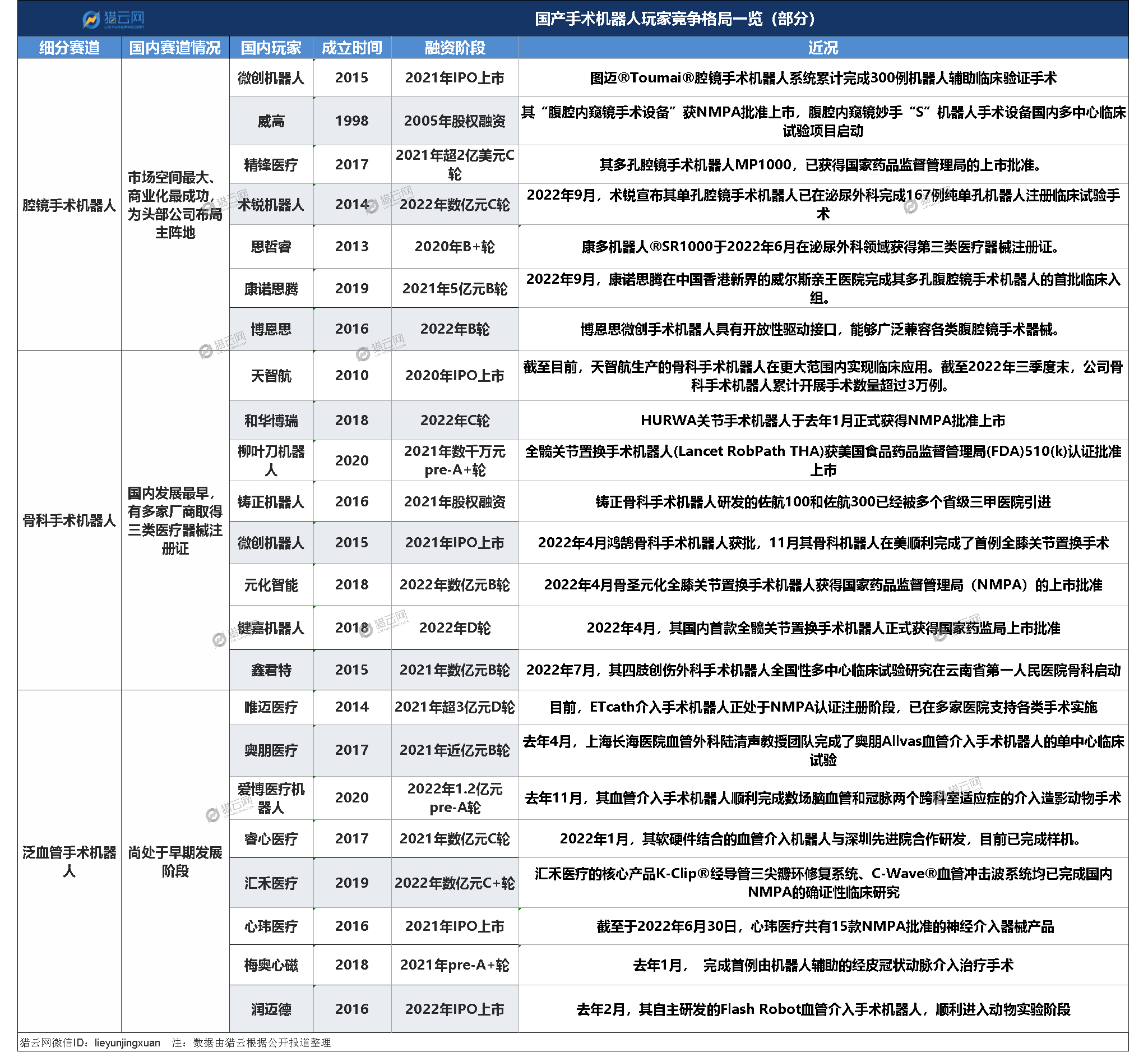 一方面机械臂、控制系统、影像系统等主要部件已大体具备国产化能力,传统外科器械公司开始入场,也通过自主研发或合作开发方式拓展到手术机器人赛道,另一方面,达芬奇机器人的专利陆续到期,都让国产手术机器人迎来了快速发展的黄金期,礼来亚洲基金、经纬创投、启明创投、招商局资本、朗玛峰创投、君联资本、鼎晖资本等明星机构纷纷入局。