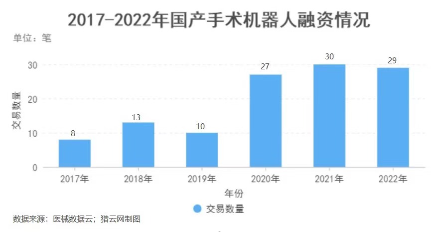 据医械数据云数据,去年手术机器人共发生29起融资事件,同比下降3.33%,是2019年以来首次的融资交易数据下滑。而在2021年几乎每个月,都有手术机器人公司宣布完成融资,过亿元融资事件超过10起。