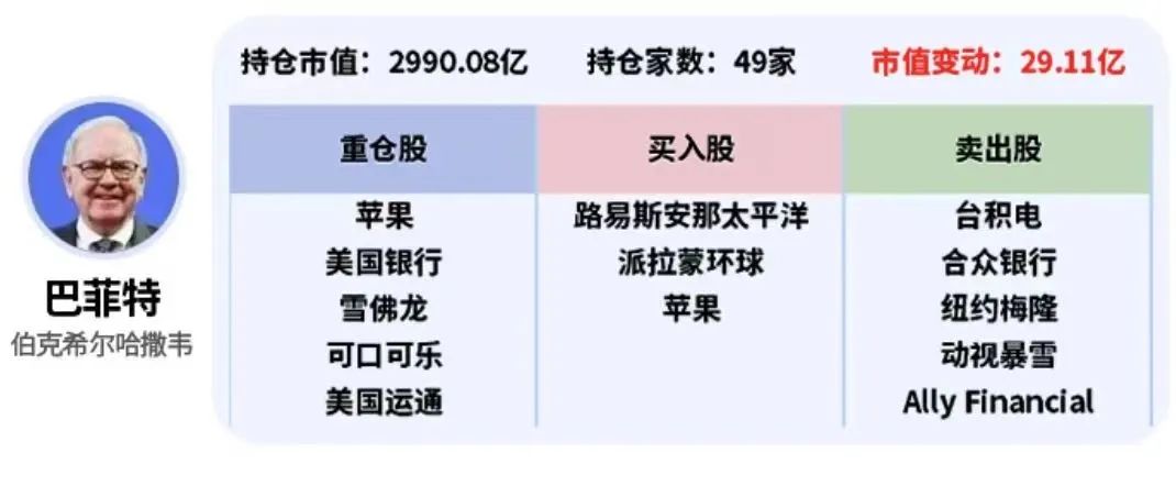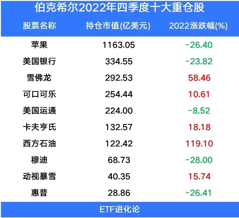 从伯克希尔具体持仓股看,2022年第四季度伯克希尔共持有49只美股,其十大持仓股分别为苹果、美国银行、雪佛龙、可口可乐、美国运通、卡夫亨氏、西方石油、穆迪、动视暴雪和惠普。
