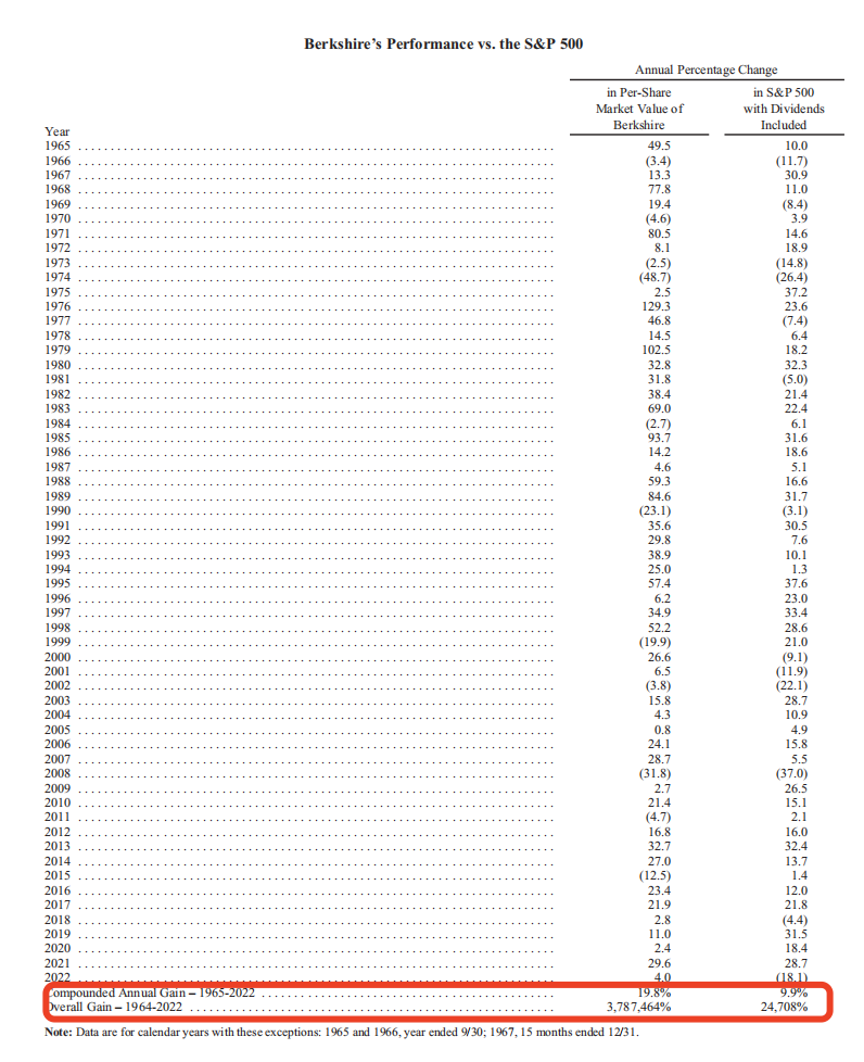 长期来看,1965-2022年伯克希尔每股市值的复合年增长率为19.8%,明显超过标普500指数的9.9%。