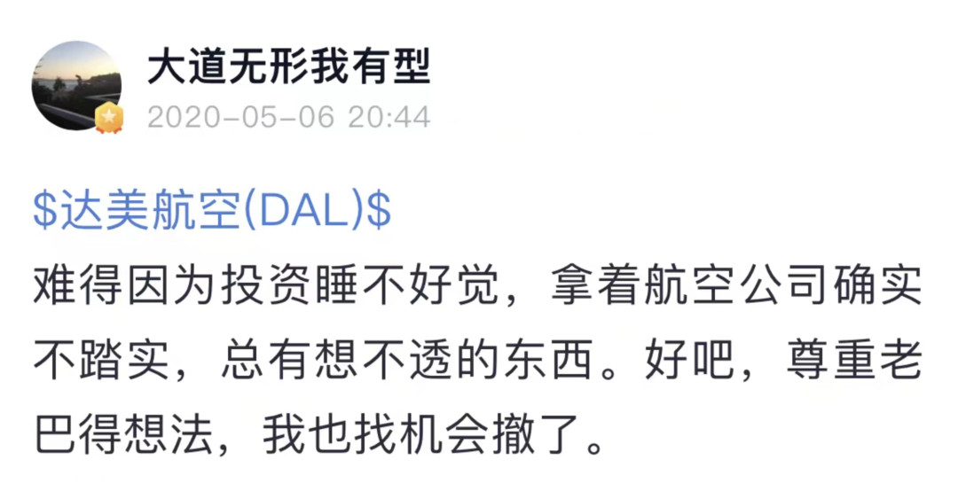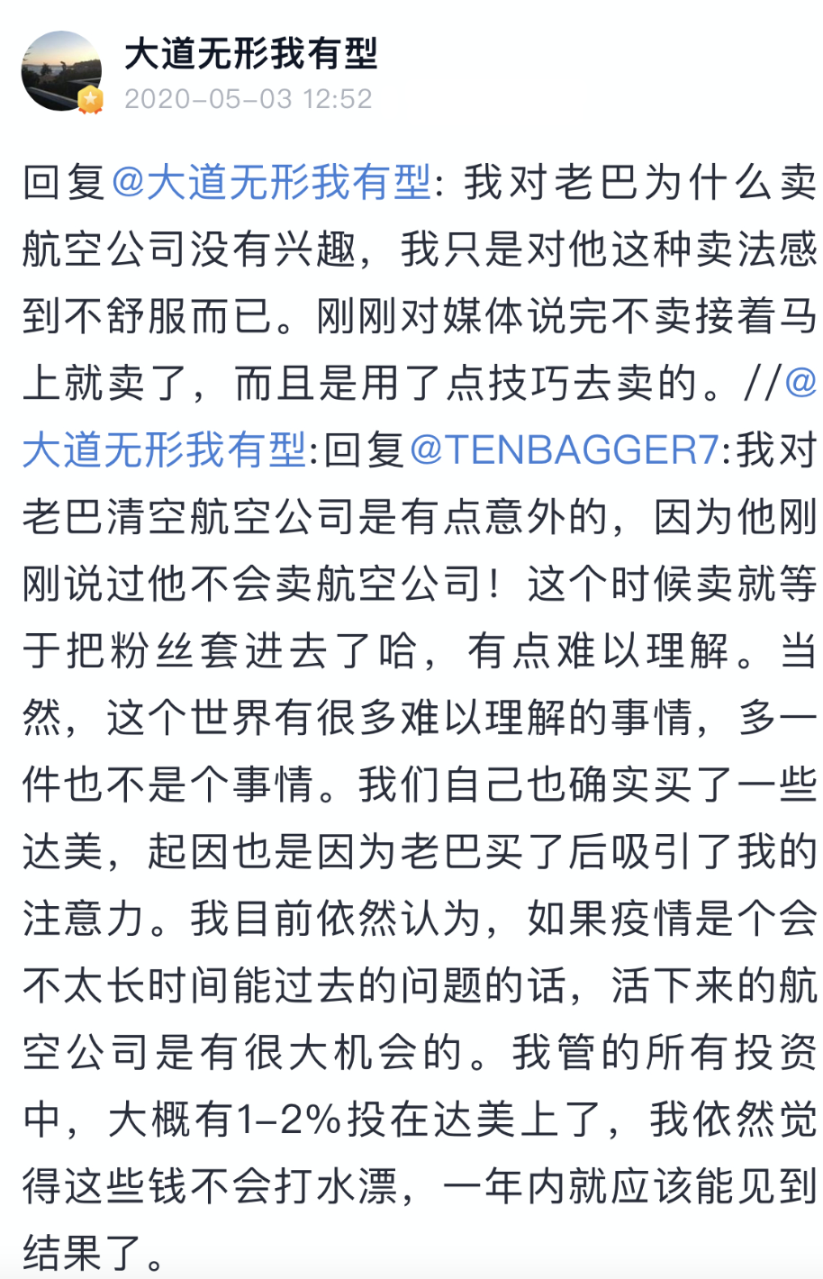 段永平在航空股上也抄巴菲特作业,买了达美航空,阿段表示:我还是认真看了看老巴买的原因,似乎也觉得蛮有道理,所以买了些达美航空。