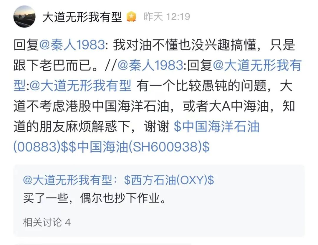 另一位网友问:“有一个比较愚蠢的问题,大道不考虑港股中国海洋石油,或者大A中海油,知道的朋友麻烦解惑下,谢谢。”