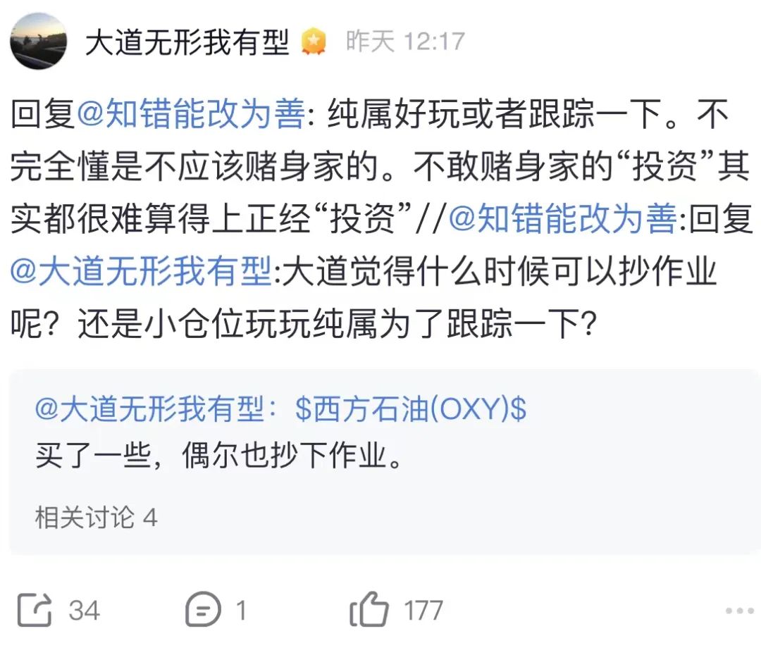 段永平随后回复道:“我对油也不懂也没兴趣搞懂,只是跟下老巴而已。”