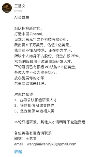 2月14日情人节,第一个响应王慧文号召的AI人才,是北京智源人工智能研究院副院长刘江,他将王慧文的这一创业项目形容为“一辈子才能遇到一次的机会,千万不要错过!”值得注意的是,刘江在此之前曾是美团的技术学院院长,和王慧文应该算是老相识。