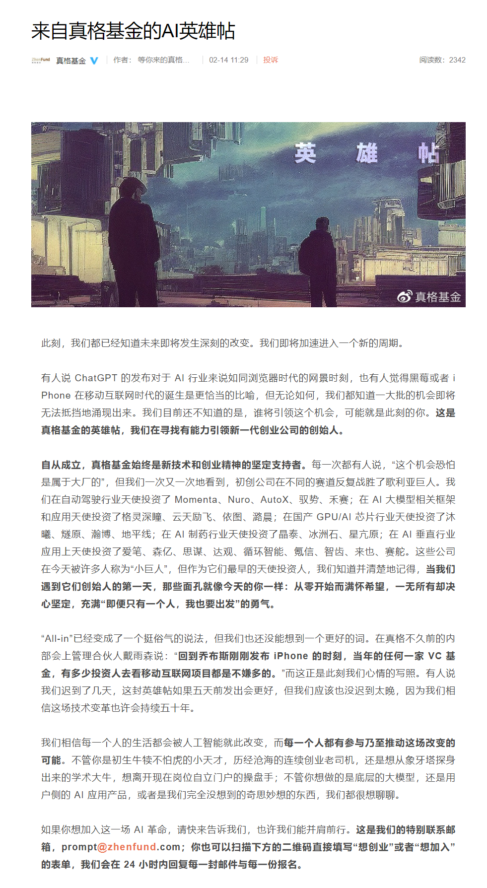 在刘江宣布加入光年之外的当天,真格基金的一则英雄帖姗姗来迟,在All-in的主旋律下,他们相信当年iPhone颠覆行业的盛况,会在AI领域再次上演。