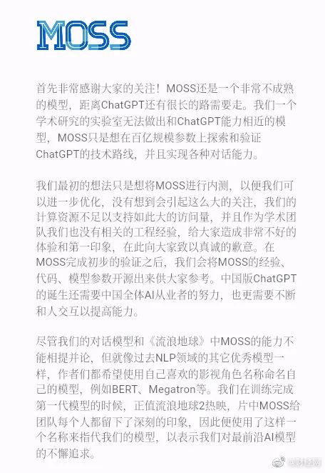 上海复旦邱锡鹏团队的MOSS,在大家都处在准备阶段时,悄然发布内测。产品发布当天,服务器不堪重压直接崩溃,这个名字引用自《流浪地球》的对话模型,在道歉中收场。