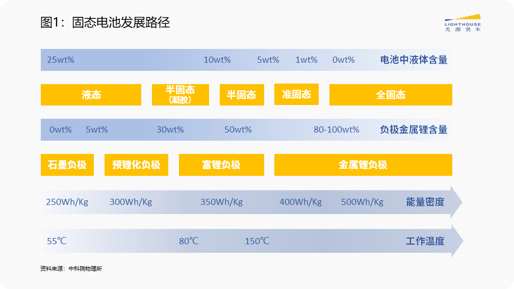 向固态锂电池过渡是锂电技术进步的重要趋势,全球范围内,各大车企、电池企业、投资机构、科研机构等在资本、技术、人才方面积极布局,以加速固态电池产业化进程。去年11月,由光源资本担任独家财务顾问的卫蓝新能源宣布完成15亿元 D 轮融资,我们看好卫蓝新能源作为国内固态锂电“国家队”在助推固态锂电池产业化、引领行业变革方面的深厚实力。本篇研究将分享光源资本对于固态锂电产业未来发展的观察与思考。