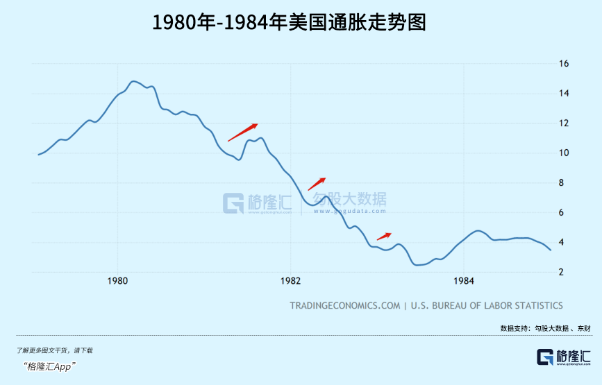 不过,美联储因为经济走弱压力,过快开启降息节奏,通胀因此没过多久卷土重来。1977年4月,通胀已经从1976年末的4.9%攀升至7%。盘整了小半年之后加速起飞,1978年末已经高达9%。1979年二次石油危机爆发,美国通胀再度失控,最高的时候飙升至14%以上。对此,美联储暴力加息至20%,通胀大幅走弱,回落过程远超1年,且中间也有不小波折。