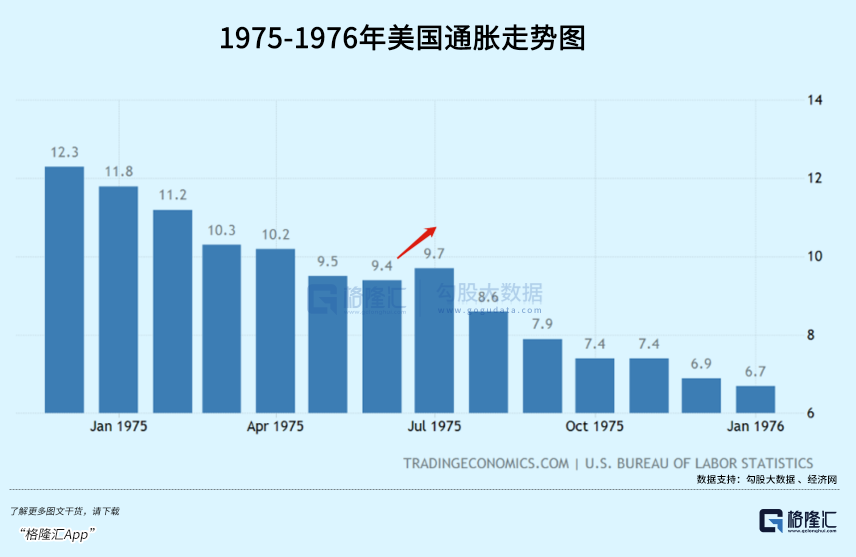 详细拆分看,1973年—1974年,美国通胀持续暴走,从3.6%飙升至12.3%。为了遏制恶性通胀,美联储从1973年初开始大幅加息,一直到1975年7月。随着加息的推进,通胀于1975年初阶段见顶回落,1975年末降低至6.7%。中途确实有过环比继续波折上升的情况。
