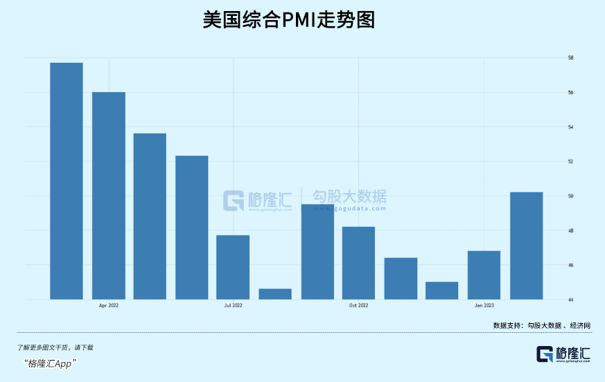此外之外,美国经济相对韧性的表现也给美元指数提供了不少上涨动力。2月21日数据,2月美国综合PMI指数攀升至50.2,创下8个月以来最高。其中,服务业PMI初值为50.5,高于市场预期的47.3,创下2022年6月以来新高,也是6个月以来首次站上50荣枯线上方。制造业PMI录得47.8,高于上月的46.9和市场预期的47.2。