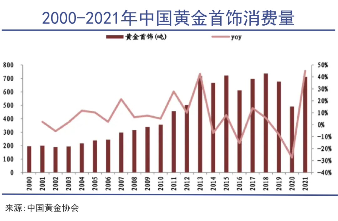 据中国黄金协会公布的数据,2020年近三年国内黄金消费量分别为820吨、1120吨、1001吨。按今年春节月市场火爆态势发展,业内人士预测2023年国内黄金消费量有望突破1100吨,再达历史高点。
