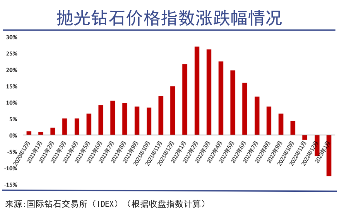 国际钻石交易所(IDEX)公布的数据显示,自2022年2月以来,钻石价格从高点一路下跌,2022年11月开始出现同比负增长,2023年春节月更是同比降幅近15%。