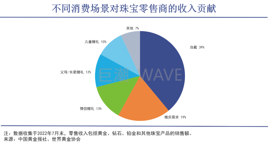 黄金的消费场景则要宽阔很多。根据中国黄金报和世界黄金协会统计的不同消费场景对珠宝零售商收入贡献的数据显示,婚庆需求黄金仅占总消费量的不到20%,赠礼和自戴才是黄金饰品的主要用途。