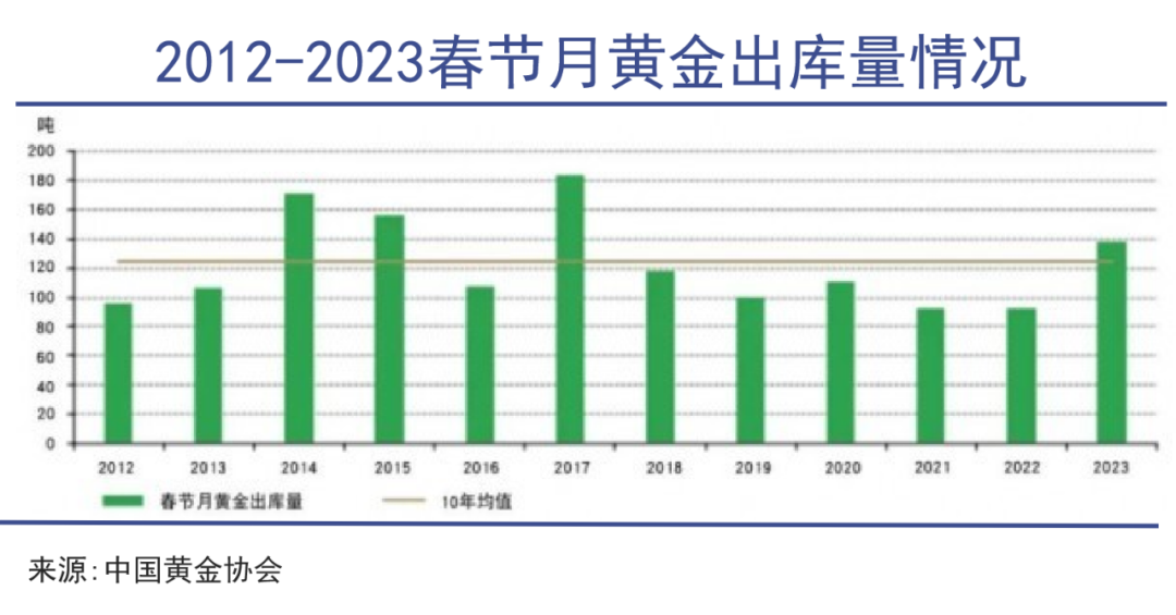 中国黄金协会数据显示,今年春节到元宵节期间,我国黄金消费同比增长18.2%,呈现出快速回暖势头。根据上海黄金交易所数据统计,2023年春节月黄金的出库量大幅度增长,创下自2018年以来的新高,比近10年春节月黄金出库量的平均值高出12%。