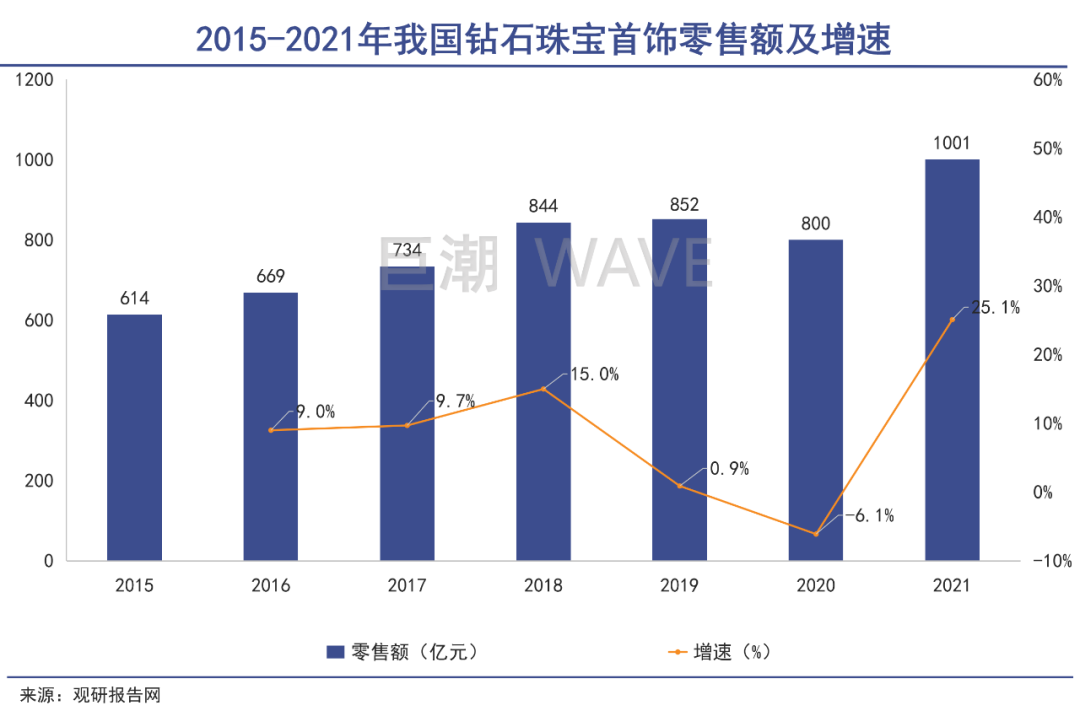 中宝协数据统计,从2015年—2021年,绝大部分年份里钻石珠宝首饰的零售额都在上涨,虽然2020年的疫情导致同比下滑了6.1%,但2021年又大幅上涨25.1%,突破1000亿元。