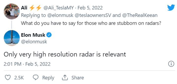 因此,依托算法优势让高分辨率的摄像头拥有了立体感知能力后,特斯拉果断砍掉了车型上的毫米波雷达。在那之后,马斯克也在推特上留下了一句伏笔:只有高分辨率的雷达才行。