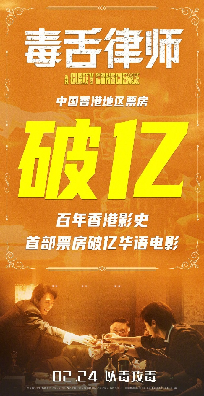 安乐影片、阿里影业出品的《毒舌律师》自香港开画以来,创下香港影史多项票房纪录:断层领跑香港春节档,蝉联三周票房冠军。超越周星驰的《美人鱼》,用了不到20天的时间取代去年的港产片票冠《明日战记》,成香港首部票房破亿华语片。