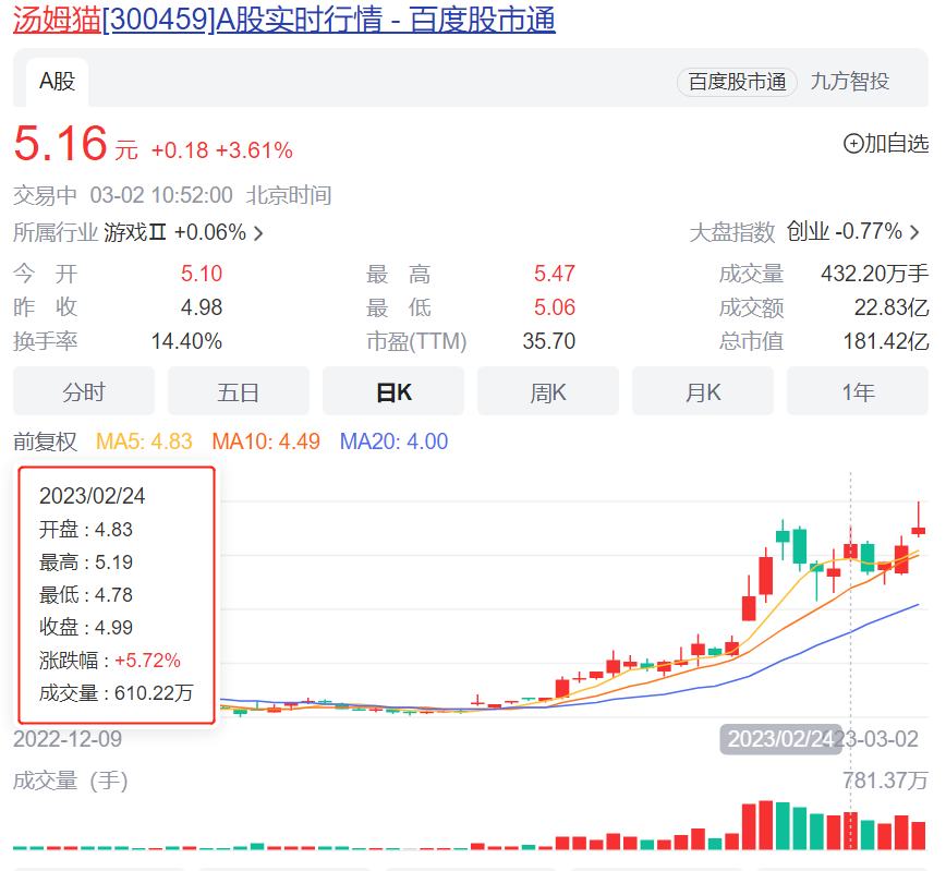 一波操作下来,汤姆猫股价大涨5.72%,当日报收4.99元/股。