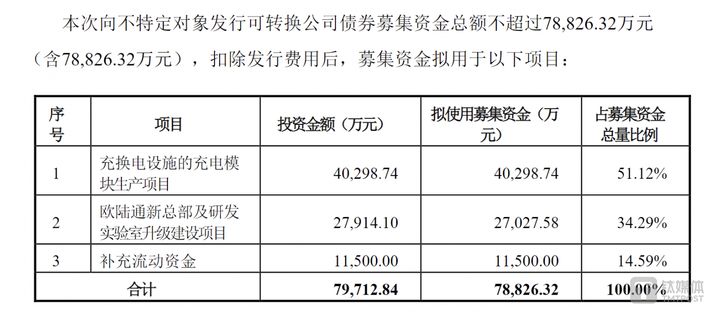 欧陆通此次向不特定对象发行可转换公司债券募集资金总额不超过7.88亿元,其中4.03亿元用于充换电设施的充电模块生产项目、2.70亿元用于欧陆通新总部及研发实验室升级建设项目、1.15亿元用于补充流动资金。