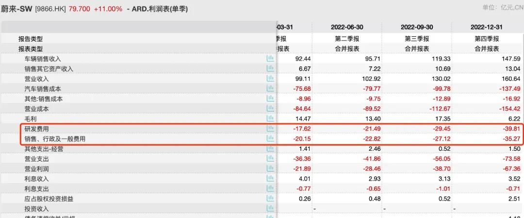 然而毛利再难看,成本支出依然刚性,烧钱仍无法停下来,蔚来研发费、销售行政费用持续提升。这背后是新平台的研发、新销售网点的布局。